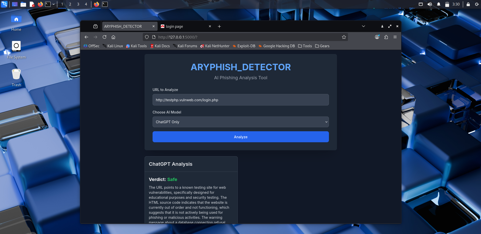 View on GitHubARYPHISH_DETECTOR is an advanced hybrid‑AI tool that uses Google Gemini and OpenAI ChatGPT to analyze URLs and detect phishing attacks in real time. Unlike traditional URL filters, it fetches the live HTML of the target page and performs deep reasoning to identify hidden threats, obfuscation, and deceptive design elements.